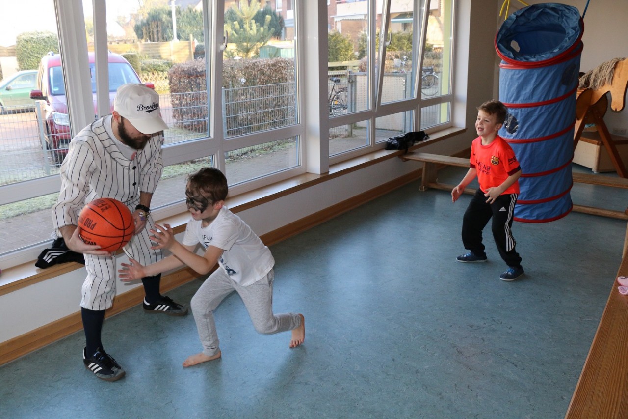 Große Freude herrschte am Freitagmorgen in unserem Bewegungsraum. Dort stand er....der lang gewünschte Basketballkorb! Er ist höhenverstellbar und kann hin und her bewegt werden. Außerdem ist der so stabil, dass er nicht gleich umkippt.