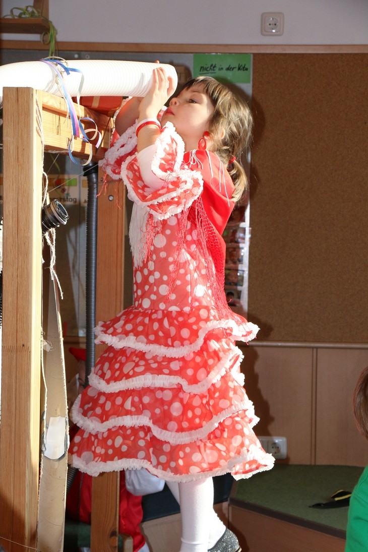 , in einer Gruppe wurden Cheerleader-Puschel oder Ball-Becher hergestellt. Außerdem gab es einen Disco-Raum, in dem auch geschminkt wurde. Mit Bewegungsliedern, zu Beginn des Tages und zum Abschluss mit allen Kindern, egal in welchen Kostümen, tobten wir uns dann nochmal richtig aus.