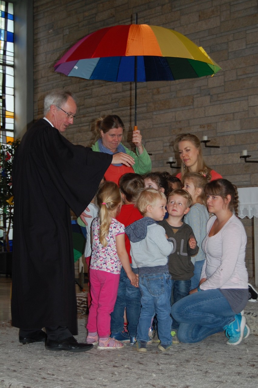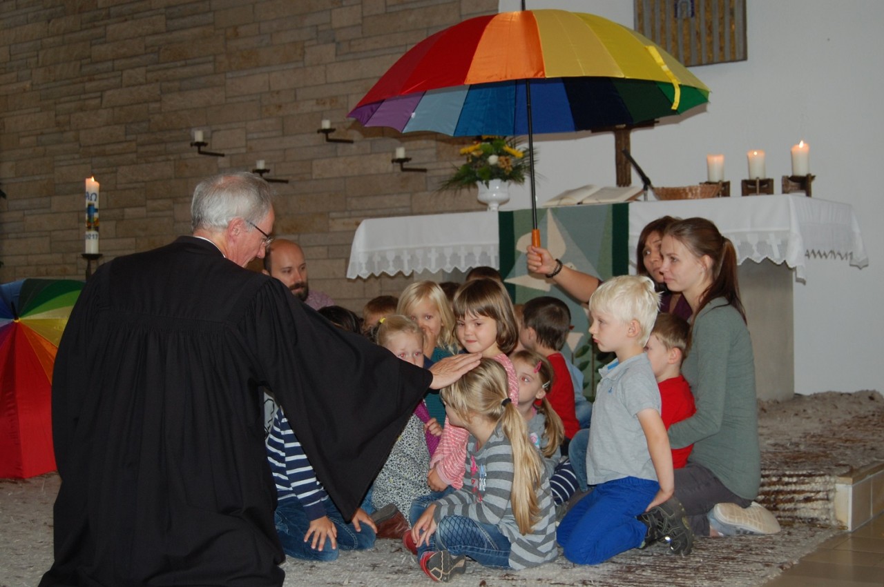 Die Schirme wurden nach dem Gottesdienst mit in die beiden Häuser genommen und hängen jetzt in den Gruppen als Segensschirme! Außerdem gab es für jedes Kind ein Segensband mit dem Text: Gott segne und behüte Dich.