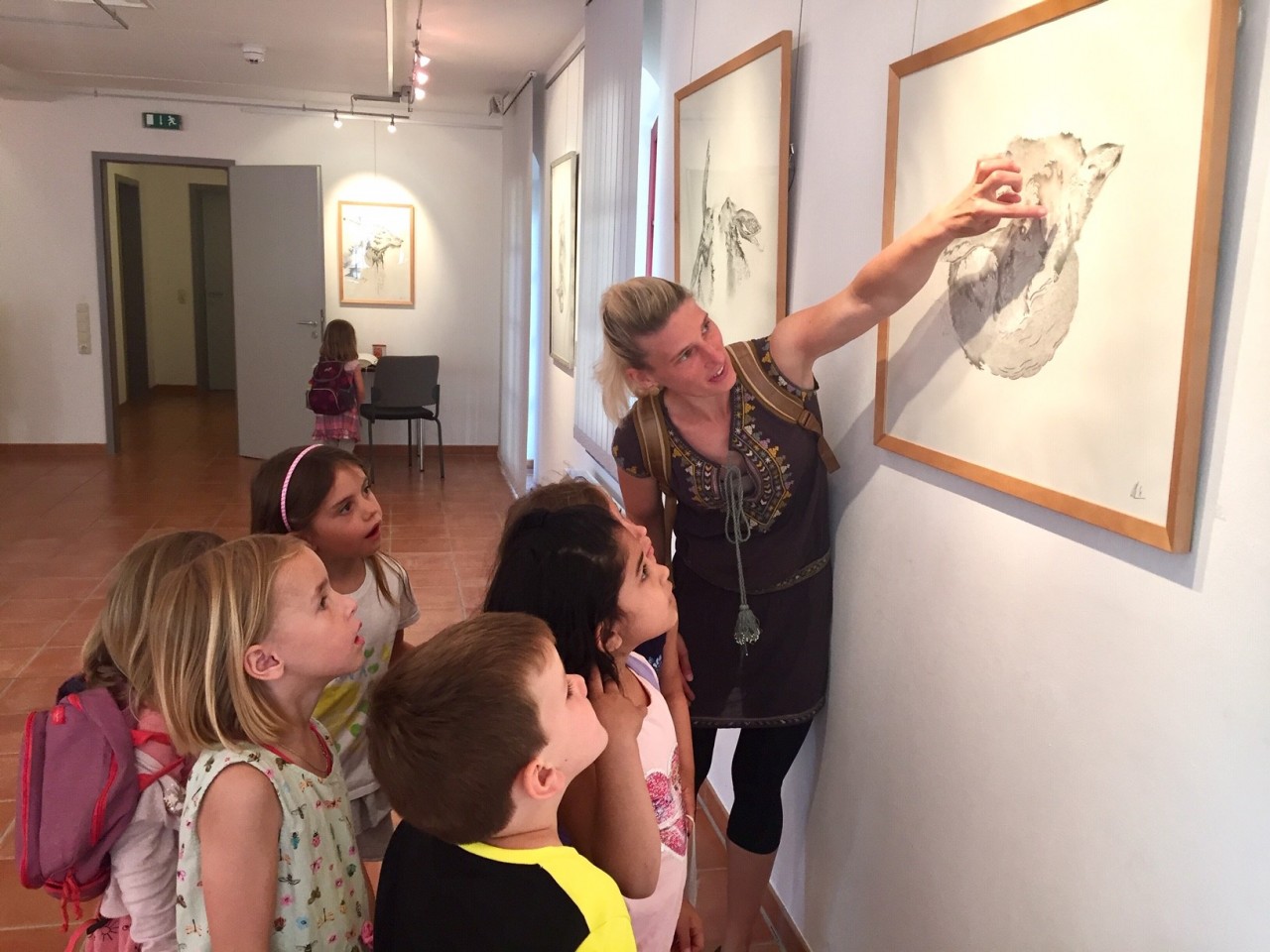 Kinder haben ja einen besonderen Blick für Kleinigkeiten und sind sehr detailverliebt, und so haben sie Marlene Treu während der Führung durch die Ausstellung viele Fragen gestellt. Zum einen über die Tiere selbst, diese Fragen konnten von der Künstlerin mit großem Fachwissen beantwortet werden, über die Zeichen- Technik, da zeigte sie ihnen einen besonderen Stift, einen sogenannten „Papierwischer“ und wie lange es dauert, so ein riesiges Kunstwerk zu zeichnen. Die Kinder waren sehr erstaunt, dass z. B. in einem so großem Bild wie dem Seepferdchen drei Monate Arbeit stecken! Auf die Frage, warum die Ausstellung diesen Namen hat, antwortete die Künstlerin, das der Name ihrem eigenem Wunsch entspringt, dass derjenige, der gejagt wird und Schutz braucht, diesen auch bekommt, egal, ob es ein Hase, ein Fuchs oder ein Wolf ist.
